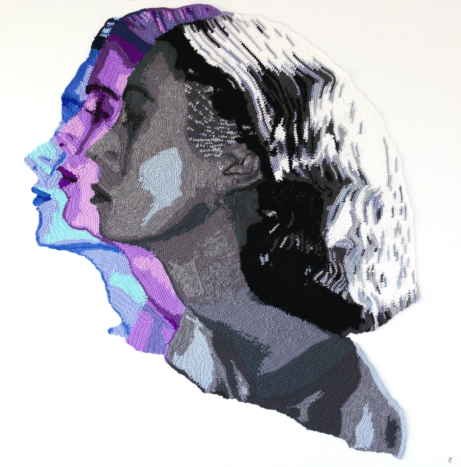 À l’aide d’un seul crochet et d’une grande variété de fils naturels et synthétiques, Chad Turner construit patiemment chacune de ses œuvres, maille après maille. Son inspiration est multiple, mais il est particulièrement attiré par les acteurs et actrices de l’âge d’or hollywoodien, les figures de fiction ou de la réalité, et par ses propres ancêtres. Pour s’aider, il s’appuie sur d’anciennes photographies, des peintures, des images générées par l’intelligence artificielle et d’autres représentations de visages. Bien qu’il explore différents styles, son travail tend vers un rendu photoréaliste. Le fil impose toutefois certaines contraintes dans le mélange des couleurs, l’amenant à développer des solutions inventives pour restituer les contrastes d’ombre et de lumière, les nuances de carnation et les variations chromatiques. Chad décrit ainsi l’apparition progressive d’un visage au fil de son chemin créatif comme une expérience profondément sublime.